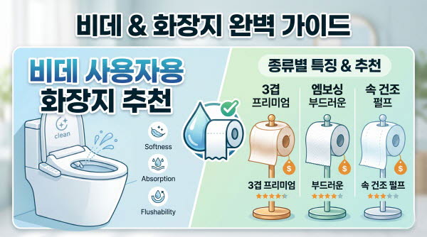 2026년 기준, 비데 사용자에게 가장 적합한 화장지 종류, 피해야 할 화장지, 실제 사용자들이 추천하는 제품까지 최대한 자세히 정리했습니다. 크리넥스, 스카트, 잘풀리는집, 롯데 등 주요 브랜드 비교도 포함!